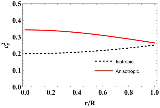 The radial profiles for isotropic and anisotropic stars are qualitatively very similar, the main difference being the value of the function at the origin, due to the fact that the relativistic adiabatic index is different from one model to another. Here we have displayed the eigenfunctions of the isotropic star. We notice that the radial profiles of the perturbations exhibit the typical behavior observed in any Sturm–Liouville problem, namely the number of zeros of the eigenfunctions equals the value of the overtone number . Our findings show that the spectrum of the anisotropic object is characterized by higher frequencies, and also by larger constant frequency separation at highly excited modes, in the case of isotropic star, and in the case of anisotropic star. Finally, for the sake of comparison, in Figure 6 we have displayed the speed of sounds versus the normalized radial coordinate both for the isotropic and the anisotropic HESS compact object. The dashed curve corresponds to the isotropic star (Tolman IV solution), while the solid curve corresponds to the radial sound speed of the anisotropic object (via Karmarkar condition in gravity). Both are finite, monotonic functions of r within the range . In the case of isotropic star increases, whereas in the case of the anisotropic star the sound speed decreases with r. The speed of sound of the anisotropic object lies above the sound speed of its isotropic counterpart, which explains why .