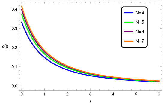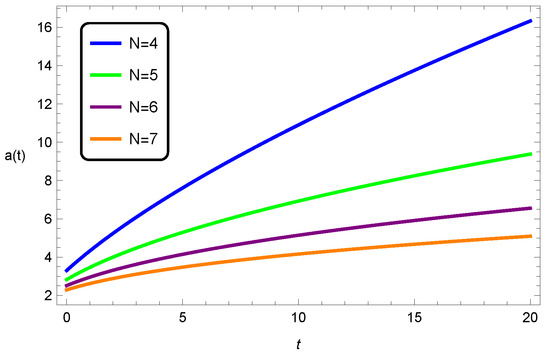 It is important to note that the scenario is the only such one where a closed-form explicit solution for the scale factor can be obtained for . We note that a closed universe is not possible in five dimensions since we have that , which contradicts (16). For all dimensions where , the solution for the scale factor is obtained in terms of special functions, namely, hypergeometric functions—the four-dimensional universe is also distinct since the implicit solution (20) can be obtained in that case. In Figure 1, we see the evolution of the scale factor (17) for several dimensions in the universe of flat spatial curvature; an increase in dimension appears to slow the scale factor’s evolution. Figure 2 depicts the behaviour of the energy density for several dimensions, with the solution (17). The energy density is everywhere positive and well defined and decreases over time, with the behaviour appearing similar for all dimensions.