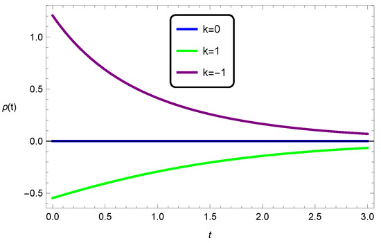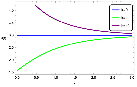Figure 3 depicts the behaviour of the scale factor for all spatial curvatures for a nonvanishing and positive cosmological constant. All three cases depict increasing behaviour; however, the rate of increase is higher for the open and closed de Sitter universes. Figure 4 depicts the behaviour of the energy density for all spatial curvatures in five dimensions. We can see that in the flat universe the energy density , and for the closed universe, the energy density is always negative, which is an unacceptable notion. However, for the open universe the situation is corrected and the energy density is positive and decreasing over cosmic time. We note that these plots were created for the five-dimensional scenario so that comparisons with the physics of the EGB universe is then a possibility.
