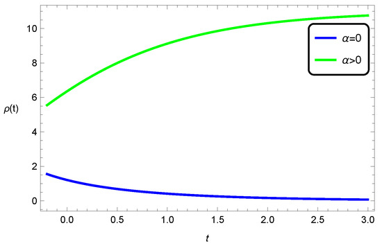 In Figure 5, we demonstrate the evolution of the scale factor in five-dimensional EGB gravity for the three spatial curvatures and a nonvanishing cosmological constant. It can be seen that for the open and closed universes, the increase is greater than for the flat universe, indicating that the presence of spatial curvature has an effect on this increase. In Figure 6, the energy density is depicted with the cosmological constant and, similarly to the general relativity case, only the open universe has physically acceptable behaviour; the closed universe violates the null energy condition, in that the energy density is negative. For the flat universe, the energy density vanishes identically. Figure 7 depicts the comparative behaviour of the energy densities of the closed universe between EGB gravity and general relativity, with the cosmological constant. Both are positive and well-behaved functions, with the general relativistic case being decreasing, and the EGB scenario being a gradually increasing function; the Gauss–Bonnet corrections are directly contributing to an increasing energy density over cosmic time. Figure 8, Figure 9 and Figure 10 depict the scale-factor evolution in general relativity against the EGB universe. In all cases, the EGB contributions enhance the rate of the expansion.