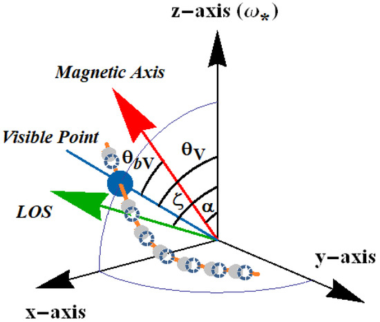 In order for the changes to be detectable, they are required to take place at emission points that are visible to the observer. We assume a geometry as outlined in Appendix B, in which the radio emission originates from source points on open dipolar field-lines whose foot-points are situated in the open-field region. From this, the location of the visible point can be determined by requiring the emission to come from the last closed-field-lines and emit tangentially to the local magnetic field-line [23,24,25] and parallel to the line of sight [32,33]. Equation (A10) specifies the polar coordinates for the location of the visible point as a function of . As varies, the visible point moves, tracing a closed trajectory after one pulsar rotation. The value of , or , is determined at the locations defined by the trajectory of the visible point , and hence it is dependent on and . An illustration of the geometry is shown in Figure 1. The apparent component of to the observer corresponds to its projection onto the trajectory of the visible point. In subsequent calculations, we refer to this particular version of unless stated otherwise. Then, visibility requires the emission to come from discrete areas on the radial spokes that are cut by the trajectory inside the open-field region. We refer to discrete emission areas as emission spots.