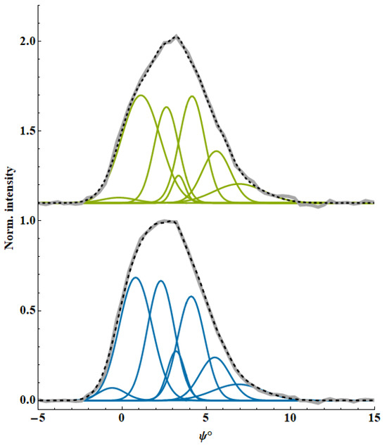 The normalized observed non-shifted (lower) and shifted (upper) profiles are indicated in gray. The seven Gaussian components that make up each of the two profiles are signified in blue and green, respectively, and their resulting profile is shown in dashed black.