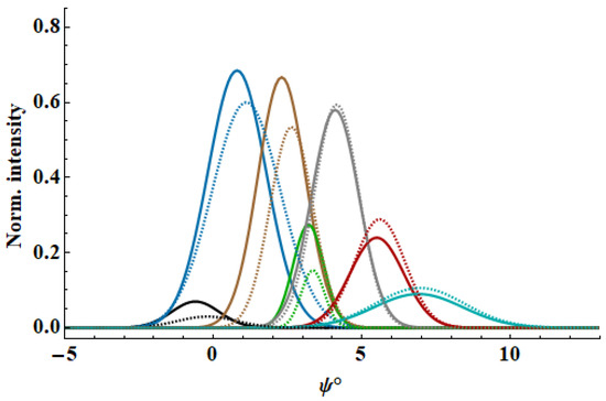 The number of emission spots (Gaussian components) cut by a trajectory of the visible point is dependent on the viewing geometry presented in Appendix B. According to Equation (A10), varies as a function of for an oblique rotator, and the trajectory cuts the emission spots at irregular phase intervals. Hence, an even distribution of emission spots around the magnetic pole does not necessarily result in the same uniform distribution along the trajectory of the visible point. In general, the number of emission spots within a fixed profile width increases as the impact parameter, , decreases. Using the same and [13] and the geometry with [17,18] presented in Section 2, we obtain seven spokes (seven emission spots) that are cut by the trajectory of the visible point. This gives in Equation (6). Since the profile width at 10% of the peak intensity does not exhibit considerable changes before and during the emission shift [13], we therefore assume that seven Gaussian components remain for both profiles. Table 1 lists the parameters for the seven components used to decompose the two profiles. The resulting fit of the simulated profiles to the observed profiles is shown in Figure 2. The goodness of fit is evaluated using between the total intensity of the observed (fixed-parameter) and corresponding simulated (free-parameter) profiles. To avoid the noise at the baseline, the tests were performed from above 5% of the total intensity of the profiles. The corresponding values are 0.019 and 0.024. Note that the fiducial plane for both profiles is assumed to be near the leading edge of the profile, as given by Tedila et al. [13].