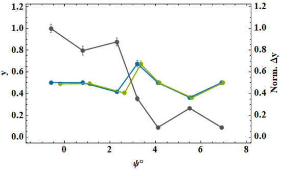 A plot showing the y values at the longitudinal phases that coincide with the peaks of the seven components for the non-shifted (blue) and shifted (green) profiles. The corresponding normalized changes in the y values, denoted by , are shown in black.