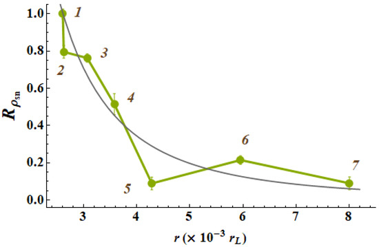 The different emission properties in the pulsar can be uncovered by examining how a given quantity varies in response to the change in the shifted emission. The emission shift is accompanied by a change in the emission state and an associated change in the plasma charge density. It is known that the charge density is related to the particle acceleration and the radio emission mechanism [16]. To explore the influence of a change in on the emission mechanism during the emission shift, we consider the change in relative to its original value. Assuming the emission associated with the non-shifted profile is the primary emission state means that the original values are those represented by the non-shifted profile, or . The relative change provides a normalized perspective for comparing the changes in the emission region at locations represented by the peaks of different components within the profile. Hence, quantifies how the plasma changes over time and reveals the properties of the radio mechanism. Figure 5 demonstrates the change in at each component peak plotted as a function of the longitudinal phase at each component peak of the non-shifted profile. It is clear that is not a constant, but it exhibits a general decreasing trend towards the trailing part of the profile. Also shown in the figure is the associated normalized relative change in the amplitude . We find that is negative around components 1–4 and then rises to positive in the last three components. A negative means , and the component amplitude reduces around the leading part of the profile when the pulsar is in the shifted emission. On the contrary, gives a positive , and the pulse amplitude increases around the trailing part of the profile. is related to when considering pulsar radio emissions coming from the inner magnetosphere [22], where the pair production is efficient. We then obtain in our model [47,48], with denoting the electrons and positrons, respectively. The pair multiplicity is signified by , and it is required to be . Assuming an identical value for all emission states implies that the plasma density is proportional to . The radio emission is then assumed to be produced in two-stream instability from ultra-relativistic plasma that streams out along the open-field-lines. This leads to the prediction that the pulse intensity is proportional to the plasma density [49,50,51], and a change in the latter leads to a change in the former. This is consistent with the changes in in the last three components, which show that a change in the pulse intensity is positively correlated with a change in the emitting plasma density. However, for large values, such as that at components 1–4, an increase in the plasma density actually reduces the pulse intensity, giving a negative value.