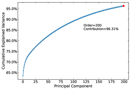 Cumulative explained variance by principal component analysis (PCA) across different orders. The x-axis represents the principal component index, while the y-axis shows the cumulative explained variance percentage. A red dot highlights the contribution rate at order 200, achieving 96.31% cumulative variance explanation.
