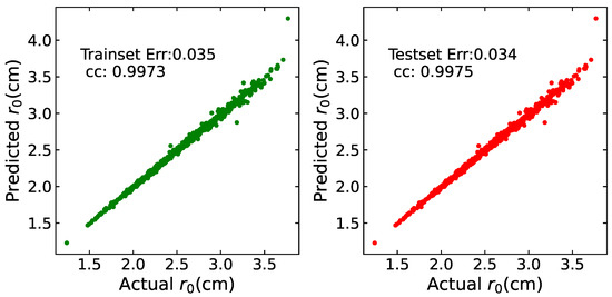 The data obtained using the spectral ratio method were tested using this approach. Seventy percent (70%) of the data were selected as the training set, and thirty percent (30%) as the testing set. The experimental results are shown in Figure 3, where the horizontal and vertical axes represent the actual and predicted values, respectively (in units of cm). The mean square error of the training set and testing set is calculated using the following formula: