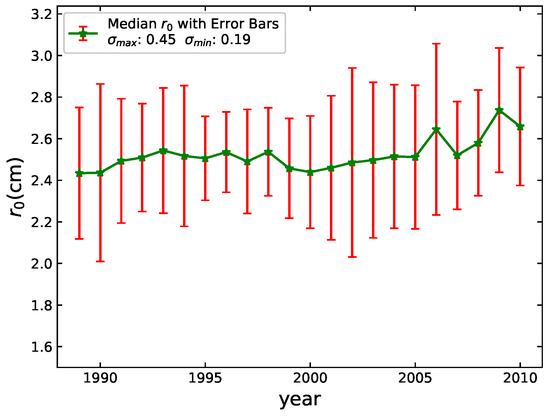 The horizontal axis is the year, and the vertical axis is the value of . From the graph, the change in seeing is basically distributed between 2.5 and 3 cm, indicating that the seeing at the HSOS is stable within two solar activity cycles.