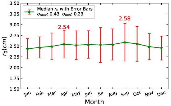 Seeing change curve from January to December. The x-axis is months, and the y-axis is in cm. April and September have higher median values than adjacent months, as indicated by the green line and red error bars for standard deviations ( = 0.43 cm; = 0.23 cm).