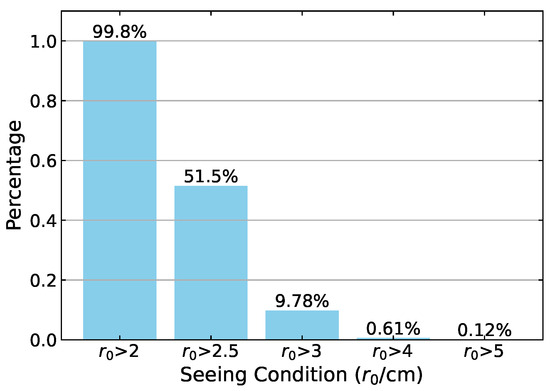 The horizontal axis represents the year, and the vertical axis represents the percentage of cm. As can be seen from the figure, from 1989 year to 2010 year, almost every year, more than of the data were observed with an of greater than 3 cm. At most, of the data were observed with an greater than 3 cm. The results indicate that the seeing conditions were stable for a considerable proportion of the observation time period at the HSOS. The proportion of different sizes of in all data is shown in Figure 7. The majority of observations () were conducted under conditions where > 2 cm, with a significant decrease in percentage as increases. We can draw the following scientific conclusions: Firstly, atmospheric seeing at the observation site is generally favorable, with the vast majority of observations () completed under conditions where exceeded 2 cm. Secondly, while the majority of observations were conducted under relatively good conditions with greater than 2.5 cm, a significant proportion were also taken under extremely favorable atmospheric conditions. This suggests that the observing site occasionally experiences periods of very stable atmospheric conditions.