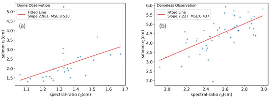In this experiment, we compared the measured by the SDIMM and the spectral ratio method by averaging the results every minute, as shown in Figure 10. We also fitted the first-order coefficients of the SDIMM and spectral ratio method under conditions with and without a dome, and we calculated their mean square error (MSE). In domeless observation, the slope of the fitting line is 2.227, and the mean square error (MSE) is 0.437. In observation with a dome, the slope of the fitting line is 2.901, higher than in domeless observation, indicating that the relationship between the spectral ratio method and is more significant under dome conditions. The mean square error (MSE) is 0.538, slightly higher than in domeless observation, which may be due to increased atmospheric turbulence under high wind speeds. Although the MSE of dome observation is slightly higher, the steeper slope under high wind speeds indicates that the dome alleviates the negative impact of wind on measurement to some extent. This may be because the dome provides additional protection, reducing the direct impact of wind on atmospheric turbulence and thus stabilizing measurement.