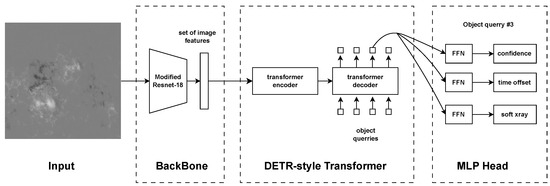 We employ a ResNet-18 architecture [23] as the backbone. Compared to deeper alternatives like ResNet-50, ResNet-18 offers a reduced parameter count, which helps mitigate the risk of overfitting given the specific characteristics and size of our dataset. Initial experiments indicated that deeper backbones like ResNet-50 did not yield significant performance gains and showed a higher tendency to overfit. To process the single-channel HMI magnetograms, the backbone’s initial convolutional layer is modified to accept a single-input channel. Pre-trained ImageNet weights are used for initialization where applicable. The final classification layer of the ResNet-18 is removed, and the feature map from the last residual block serves as input to the transformer. The backbone can be fine-tuned during training. Following the backbone, a DETR-style transformer architecture [19,24] with an encoder–decoder structure processes the extracted features. A 1 × 1 convolution reduces the feature dimension before feeding the features into the encoder. Fixed sinusoidal positional encodings are added to the features to provide spatial information. The encoder uses multi-head self-attention and feed-forward networks (FFNs) with ReLU activation, applying layer normalization before each sub-layer (pre-norm) to refine the image features, producing a context-aware memory.