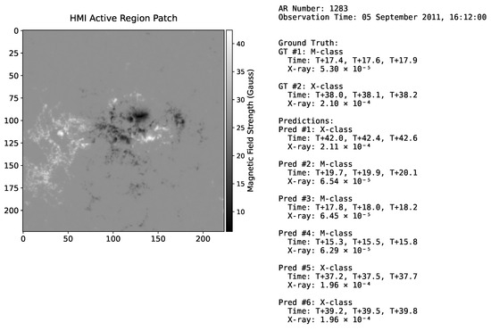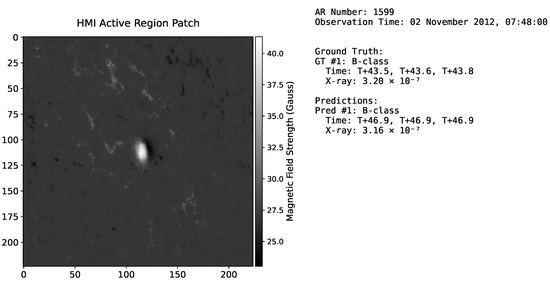 To further evaluate the model’s practical applicability and provide concrete examples of its predictive performance, we present sample prediction cases. Figure 2, Figure 3 and Figure 4 showcase selected prediction instances, visually comparing the model’s outputs—including the X-ray intensity and time offset predictions—against the ground-truth solar flare events. These examples help illustrate how the model performs in different scenarios. For instance, Figure 2 (Sample A: AR 1283; 12 November 2012) displays an instance of a correct prediction; the input HMI active-region patch is shown on the left, and in the right panel, the single ground-truth flare is successfully identified by the model, resulting in one True Positive (TP). In contrast, Figure 3 (Sample B: AR 2454; 12 November 2015) demonstrates a case of missed detections. Here, three ground-truth flares occurred, but the model did not produce any corresponding predictions, leading to three False Negatives (FNs). Figure 4 (Sample C: AR 1283; 5 September 2011) exemplifies a scenario with two ground-truth flares, where the model generated six predictions. Two of these were correctly matched to the ground-truth flares (two TPs), while the remaining four were False Positives (FPs), indicating instances of over-prediction or false alarms. These visual case studies offer insights into the model’s behavior and the nature of True Positives, False Positives, and False Negatives that are quantified in our subsequent evaluation.
