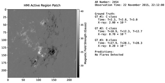 Input for Sample B (AR 2454; 12 November 2015 22:12:00) and the corresponding model inference result, illustrating a case of three False Negatives (FNs) where ground-truth flares were missed.