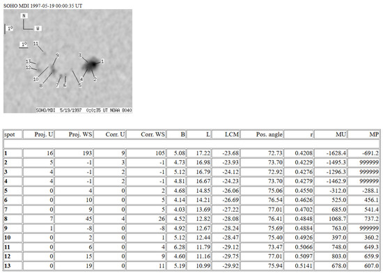 Similarly to Figure 1, this figure contains a catalog entry for sunspot group NOAA 8040, but from a different observational time. Although 19 sunspots are present, only 14 rows are shown due to space constraints. This example demonstrates an incorrect merging of spots 9–12: the “MU” (magnetic field strength) column reveals inconsistent umbral polarities, with spot 10 showing negative polarity while the others are positive, indicating a possible merging error.