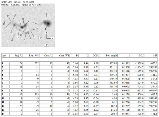 The two databases contain numerous physical parameters with a temporal resolution of 1 to 1.5 h, enabling the high-resolution tracking of sunspot evolution. Figure 1 and Figure 2 demonstrate the internal structure of the datasets, using observations of sunspot group NOAA 8040 at two different times for illustration. In addition to illustrating the group’s temporal development, these figures highlight how individual sunspots are recorded and sometimes merged in the databases.
