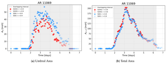 The data selection process involved several key steps that are illustrated in Figure 3, which shows the temporal variations of the umbral area (panel (a)) and total area (panel (b)) of sunspot group AR 11069. First, we determined the overlapping observation intervals for each sunspot group, as the start and end times of measurements often differed between the two instruments. To minimize the influence of projection effects near the solar limb, we excluded data points where , with r being the normalized distance from the center of the solar disc. These excluded points are shown as lighter-colored markers in the figure, while the data used for averaging are indicated by darker markers. Averages were computed over 12 h, 24 h, and 48 h intervals for umbral and total areas, sunspot counts, and magnetic field strengths. Specifically, 13 sunspot groups were suitable for 12 h averaging, 25 for 24 h intervals, and 54 for 48 h averaging.