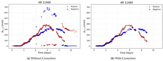 The polarity-separated area measurements of NOAA 11460. Blue and red markers denote the negative- and positive-polarity components, respectively. Darker symbols correspond to observations within , while lighter symbols indicate measurements taken closer to the limb (). Panel (a) shows the result without correcting for misclassified sunspots, leading to significant outliers. Panel (b) displays the improved separation seen after removing affected entries, leading to a more consistent polarity distribution.