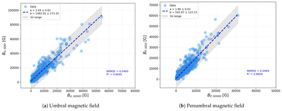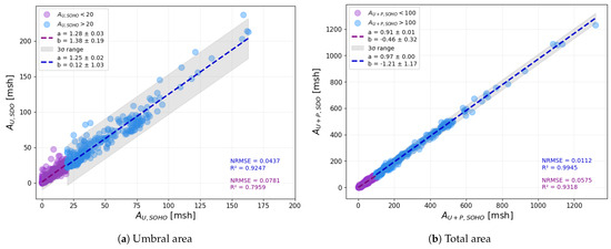 The correlation of umbral areas (panel (a)) and total sunspot areas (umbra plus penumbra; panel (b)) between SOHO/MDI and SDO/HMI measurements. In both panels, SOHO/MDI values are plotted along the x-axis and SDO/HMI values along the y-axis. Data points are color-coded by magnitude: purple for smaller areas, blue for larger ones. Separate linear fits are shown for each subset, with dashed lines in their corresponding colors. The slopes (parameters ‘a’) and intercepts (parameters ‘b’) of the fitted lines, along with their uncertainties, are displayed in the top-left corner of each panel. The gray shaded region indicates the confidence interval around the fits, where is the standard deviation of the data points. Normalized Root Mean Squared Error (NRMSE) and coefficient of determination () values are provided in the bottom-right corner, color-coded according to their respective regression line.
