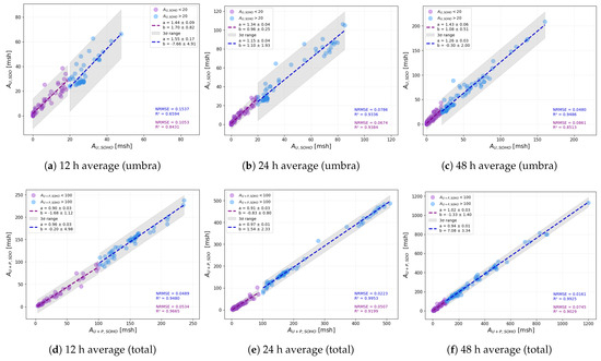 Figure 8 presents the results of our comparison of averaged area values. The top row displays data for umbral areas, while the bottom row corresponds to total sunspot areas. Panels (a) and (d) show values averaged over 12 h intervals, panels (b) and (e) represent 24 h averages, and panels (c) and (f) illustrate results based on 48 h averaging.