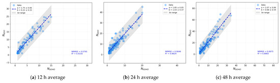 Comparison of the average number of sunspots identified by SOHO/MDI and SDO/HMI over three different temporal intervals: 12 h (panel (a)), 24 h (panel (b)), and 48 h (panel (c)). Visual elements and regression details follow the same conventions as in Figure 5.