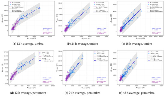 The correlations between the averaged magnetic field strengths in the SOHO/MDI and SDO/HMI datasets, with umbra (top panels) and penumbra values (bottom panels) shown separately. The averaging intervals are 12 h (panels (a,d)), 24 h (panels (b,e)), and 48 h (panels (c,f)). Small and large values are distinguished by color: purple is used for values below the thresholds (5000 G for umbra, 3000 G for penumbra), and blue for values above these thresholds. Dashed lines represent the linear fits for each subset, and corresponding fit parameters, intervals, and the NRMSE and values, are displayed as in Figure 7.