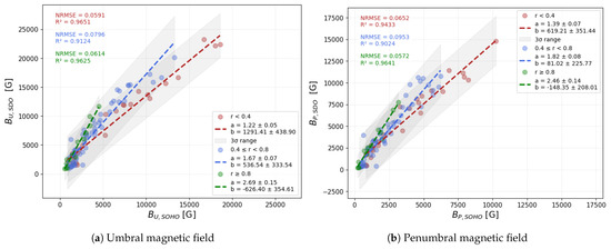 Same as in Figure 5, but for the magnetic field strengths measured in the umbra (panel (a)) and penumbra (panel (b)).