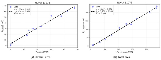 The correlation between the areas measured by SOHO/MDI and SDO/HMI for NOAA 11076, using 12 h averaged values. Panel (a) shows the relationship for its umbral area, while panel (b) illustrates the relationship for the total area of the sunspot group. The parameters of the fitted linear regression and the value are provided in the top-left corner of each panel.