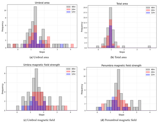 Next, we examined the distribution of slopes derived from both area-based and magnetic field strength-based fits. Figure 14 presents a combined view of these distributions, integrating the results from umbral and total area fits (panels (a) and (b)), as well as umbral and penumbral magnetic field strength fits (panels (c) and (d)). Slopes for the three averaging intervals are shown in different colors: blue for 12 h, red for 24 h, and gray for 48 h averages.