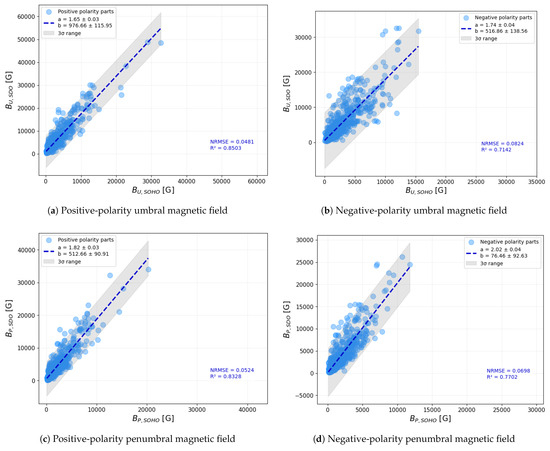 In a related study, Liu et al. (2012) [11] performed comparisons of magnetic field strengths across both polarities but did not analyze them separately. To provide a more direct comparison with their results, we also carried out an additional analysis where magnetic field values from both polarities were considered simultaneously, retaining their respective signs rather than taking absolute values. In this approach, positive- and negative-polarity measurements were combined into a single dataset, preserving the original polarity of each measurement. Linear fitting was then applied across the full range of signed data points. The outcome of this approach is shown in Figure 16, where umbral magnetic field values are presented in the left-hand-side panel, and penumbral values are shown on the right. The overall correlation structure seen here exhibits slight differences compared to the correlation obtained using unsigned values, as seen in Figure 7, providing additional insight into the asymmetry between the polarities.