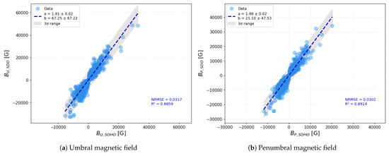In this section, we compare sunspot properties measured by SOHO/MDI and SDO/HMI within 1 min intervals. To evaluate the similarity between the two datasets, we applied linear regression fits and computed two key statistical metrics: the Normalized Root Mean Squared Error (NRMSE) and the coefficient of determination (). The NRMSE quantifies the average deviation of the predicted values from the actual measurements, normalized by the range of the dataset, providing a scale-independent measure of error. On the other hand, indicates the proportion of variance explained by the model, with values closer to 1 suggesting a strong linear correlation. It is important to note that specifically reflects the goodness-of-fit under the assumption of linearity and does not characterize general or non-linear associations between variables.