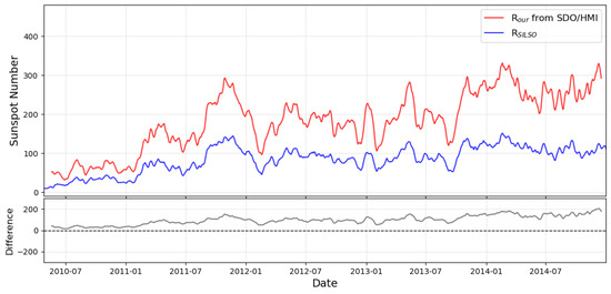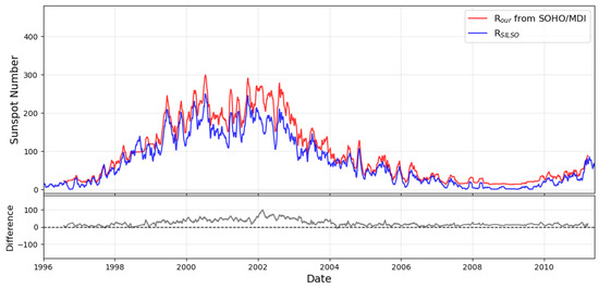 Comparison between the 30-day smoothed daily sunspot numbers derived from SOHO/MDI data (, red) and the official SILSO record (, blue) over the period 1996–2011. The bottom panel shows the difference between the two time series (). Our sunspot number estimates are consistently higher, particularly around the solar maximum, reflecting the increased sensitivity of our method toward small sunspots.
