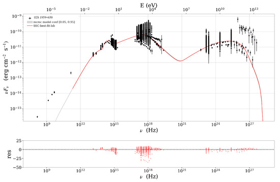 - Krawczynski, H.; Hughes, S.B.; Horan, D.; Aharonian, F.; Aller, M.F.; Aller, H.; Boltwood, P.; Buckley, J.; Coppi, P.; Fossati, G.; et al. Multiwavelength Observations of Strong Flares from the TeV Blazar 1ES 1959+650. Astrophys. J. 2004, 601, 151. [Google Scholar] [CrossRef]