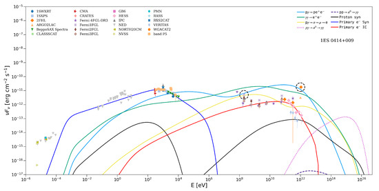 - Kelner, S.R.; Aharonian, F.A. Energy spectra of gamma rays, electrons, and neutrinos produced at interactions of relativistic protons with low energy radiation. Phys. Rev. D 2008, 78, 034013–034028. [Google Scholar] [CrossRef]