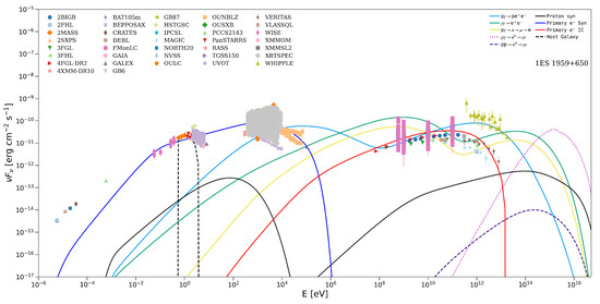 - Acciari, V.A.; Ansoldi, S.; Antonelli, L.A.; Engels, A.A.; Baack, D.; Babić, A.; Banerjee, B.; De Almeida, U.B.; Barrio, J.A.; González, J.B.; et al. Broadband characterisation of the very intense TeV flares of the blazar 1ES 1959+ 650 in 2016. Astron. Astrophys. 2020, 638, A14. [Google Scholar]