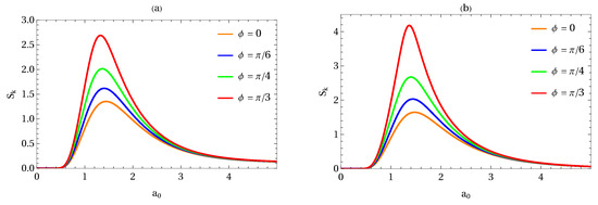 Entanglement entropy as a function of the parameter for different values of the azimuthal angle (). (a) ; (b) . Here, we fixed , , , and .
