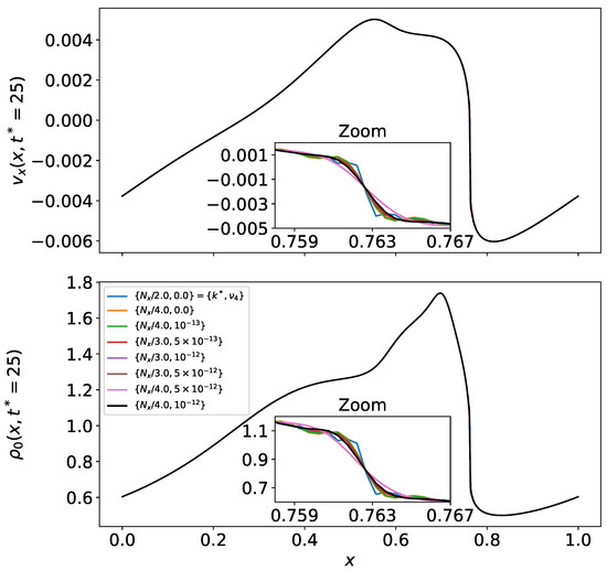 High-amplitude shock wave profiles for the x-component of the velocity (top) and the rest-mass density (bottom) at , displayed for different spectral filters and dissipative coefficients . The inset provides a magnified view of the shock region, centered around , for both fields.