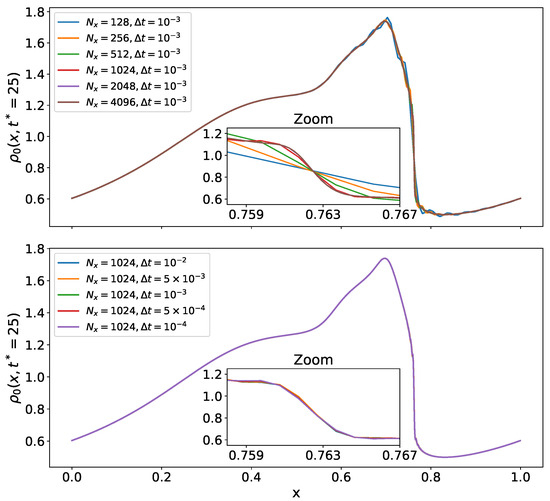 Having selected the optimal filter and dissipation coefficient, we proceeded to perform a convergence test to assess the efficiency of the new code formulation. This involves evolving nonlinear classical sound waves while systematically refining the spatial and temporal resolution to assess the accuracy of the computed solutions. As depicted in Figure 2, we analyzed the convergence behavior of the rest-mass density . The results reveal clear convergence for spatial resolutions exceeding . In this regime, the red, purple, and brown lines in the top panel become nearly indistinguishable, indicating that further spatial refinement introduces negligible changes to the numerical solution. As for the temporal resolution, convergence is already achieved for time step sizes around . Indeed, all curves in the bottom panel exhibit a consistent and closely aligned trend, suggesting that temporal discretization errors are sufficiently minimized at these finer resolutions.