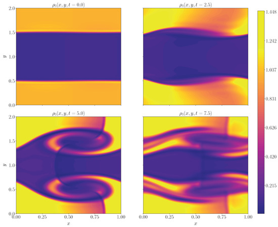 As a second test, we aimed to trigger the KHI within the framework of special relativity, following the setup described by Beckwith and Stone [48] and Radice and Rezzolla [49]. As is common in numerical studies, we adopted hyperbolic tangent profiles to smoothly capture the shear interface. To ensure periodic boundary conditions in both spatial directions, a double-hyperbolic-tangent profile was employed. The two-dimensional spatial domain is defined as , with and , and it is discretized using a grid of points. The velocity shear is imposed through the following profile: