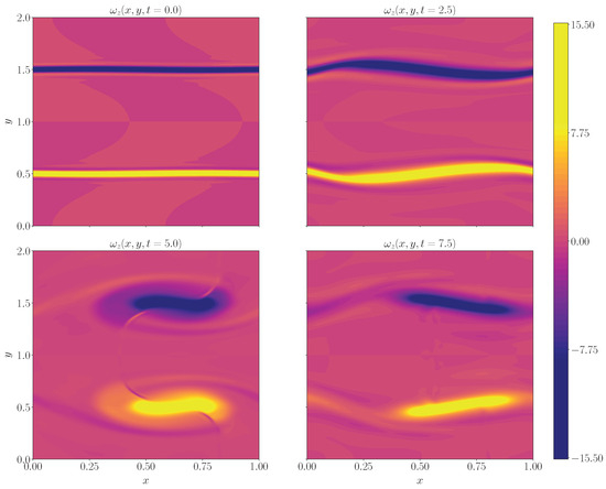 The simulation is performed up to , allowing the characteristic Kelvin–Helmholtz rolls to fully develop and become clearly distinguishable. As shown in Figure 3, the onset of the instability in the rest-mass density becomes evident around . The evolution closely matches the numerical results reported by Beckwith and Stone [48] and Radice and Rezzolla [49] for a single-mode perturbation. Figure 4 displays the only non-vanishing component of the vorticity, , which serves as a key diagnostic of rotational motion and shear amplification, highlighting regions of intense fluid rotation. It provides a clear picture of the transition from linear growth to nonlinear saturation, making it an essential tool for analyzing vortex dynamics and the energy cascade in shear flows. As can be inferred from the figure, the vorticity is initially concentrated along a narrow shear layer at the interface between two fluid layers moving with opposing velocities. As the instability develops, small-scale perturbations grow and roll up into coherent vortices, clearly visible as alternating regions of positive and negative vorticity. Remarkably, the full nonlinear development of the KHI is successfully captured using the logarithmic formulation of GRHD introduced in Section 2. This approach, applied here in the context of flat spacetime, enables a stable numerical treatment of the steep gradients that characterize the instability while also providing an efficient framework for simulating its complex nonlinear dynamics.