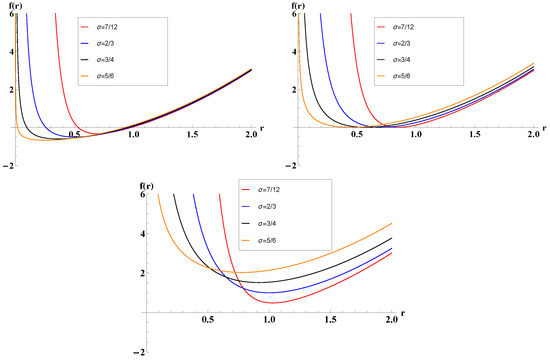 In the present manuscript, for the above range, we consider the propagation of a scalar field only in well-defined spacetimes with two horizons, i.e., within , preventing the presence of a naked singularity. In Figure 2, we display three different panels representing the qualitative behaviors of .