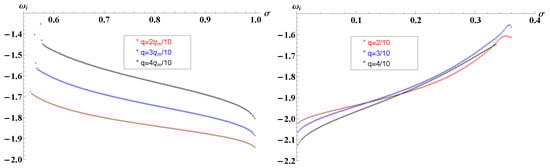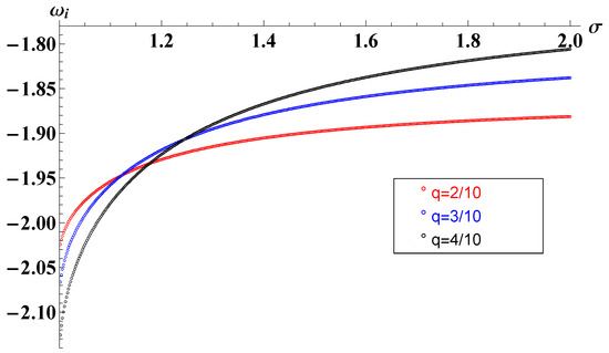 After developing the Frobenius method numerically, we employ it with a series expansion of 45 terms, checking it afterwards with a 60-term series. The results exhibit very good convergence, with less than deviation. In Figure 4, we show the quasinormal modes for theories with considering multiple values of q.