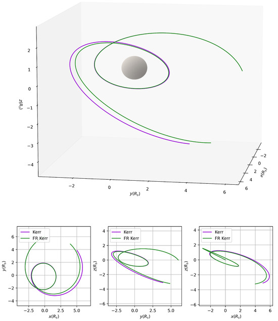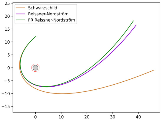 In Figure 2 we qualitatively plot a timelike orbit of a unit mass and charge particle in the above potential. The motion is compared to the respective orbits in the standard GR Schwarzschild and Reissner–Nordström spacetimes with identical initial conditions, whereas the orbital energy differs as a result of the modified energy integral. The orbits are quickly precessing Keplerian ellipses and fall back to the classical Schwarzschild orbit in the zero charge and limit.