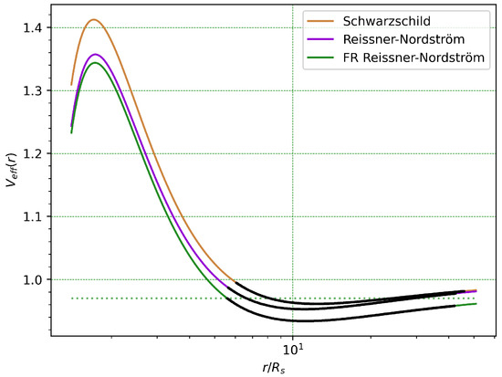 (Top) Bounded timelike orbits of a unit mass and charge particle in a Finsler–Randers–Reissner–Nordström, classical Reissner–Nordström, and classical Schwarzschild spacetime. The black hole Schwarzschild radius is set to 1 and the photonsphere (red dashed circle), identical for all three spacetimes, lies at . (Bottom) The radial motion of the orbits (black trail) on the respective effective potential. For all orbits we choose and determine the initial conditions so that for the FRRN orbit (green dashed line). For the spacetime parameters we have additionally set and . The radial motion integration is performed using a nested 4th-order Runge–Kutta algorithm.