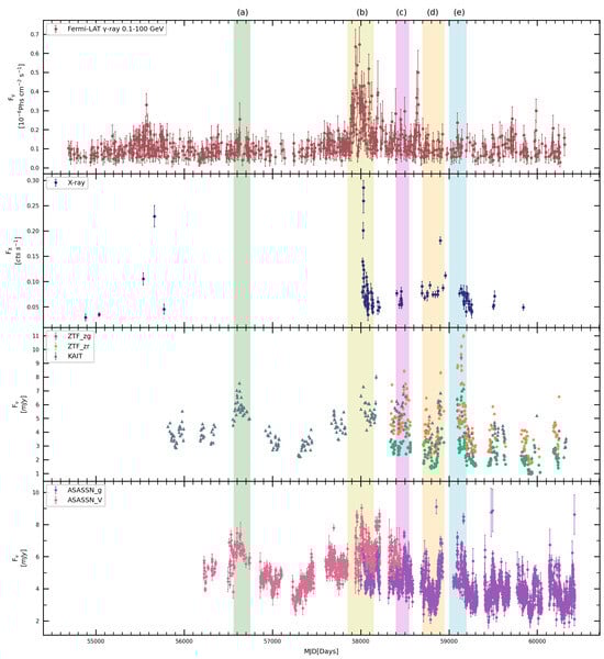 From top to bottom, the panels exhibit the light curves of -ray of 0.1–100 GeV, X-ray of 0.3–10 keV, optical from KAIT and optical r band and g band from ZTF, optical V band and g band from ASSA-SN, and radio 15 GHz, respectively. Different background colors also represent different periods. The green zone represents period (a) from MJD 56,560 to MJD 56,750, the yellow zone represents period (b) from MJD 57,850 to MJD 58,150, the pink zone represents period (c) from MJD 58,400 to MJD 58,550, the orange zone represents period (d) from MJD 58,700 to MJD 58,950, and the blue zone denotes period (e) from MJD 59,050 to MJD 59,200.
