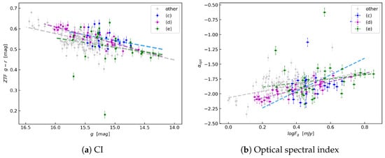 (a) versus g band magnitude of ZTF. Linear fits for the color indices versus magnitudes are represented by dashed lines. (b) The optical spectral index versus . Linear fits of (c), (d) and (e) are represented by dashed line.