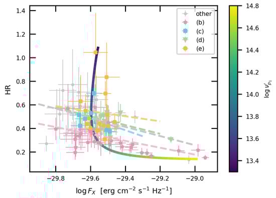 The plot of X-ray HR versus . Linear fits for these correlations are represented by dashed lines. The theoretical curve of the log-parabolic model is depicted by the solid curve, and the log [Hz] varies from 13.3 to 14.8, denoted by the right color bar. For synchrotron and SSC, the curvatures are and , and the intrinsic fluxes are and .