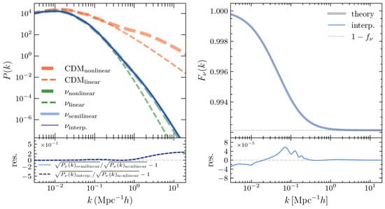 Here is the CDM power spectrum calculated in simulation (see Section 2.3). is the neutrino power spectrum using equation form Equation (63) of [17] derived from the integral of the total matter power spectrum evolution.