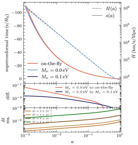 Expansion history (solid line) and Hubble expansion rate (dashed line), as functions of scale factor a, computed using the on-the-fly method (red). Different neutrino masses (blue) cause a variation in the expansion history. The bottom panel shows the impact of the integration time-step size on accuracy.