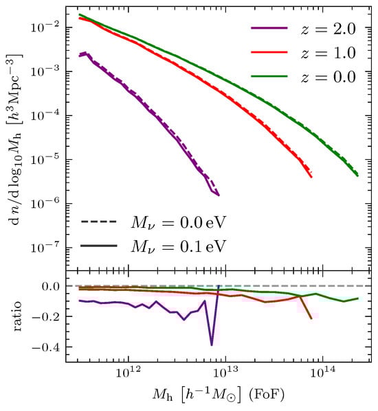 The neutrino mass effects on halo statistics are shown in Figure 6. It compares two cosmological scenarios: one with massless neutrinos and the other with massive neutrinos of total mass ; furthermore, the evolution of the HMF from to is shown.